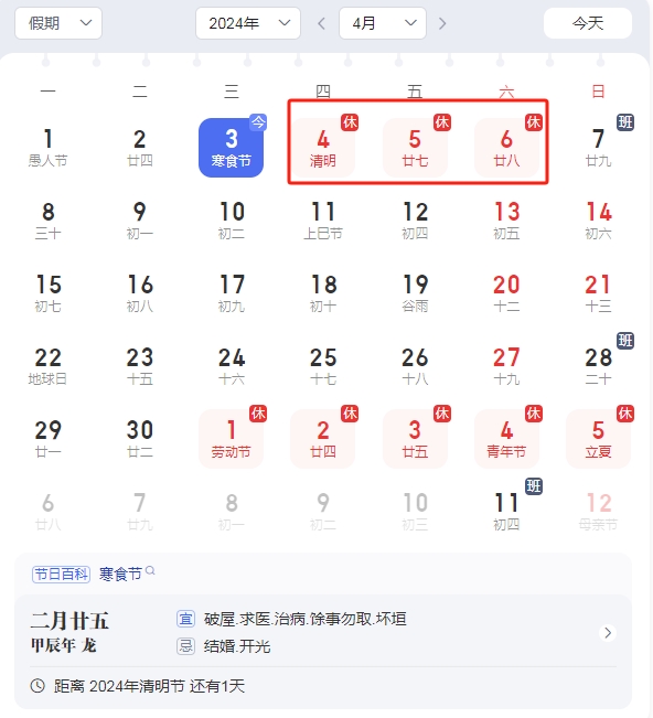 2024年清明節放假時間安排: 4月4日(星期四)至4月6日(星期六)放假調休,共3天。4月7日(星期日)上班。