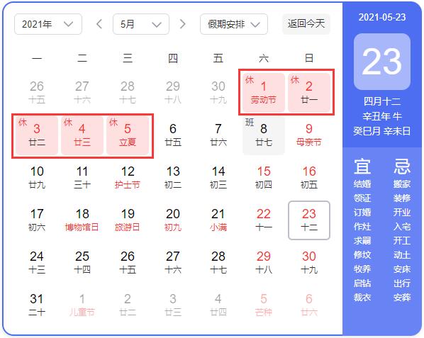 4月24日(星期六)放假,4月25日(星期日)上班;5月1日(星期六)至5日(星期三)放假調(diào)休,共5天。