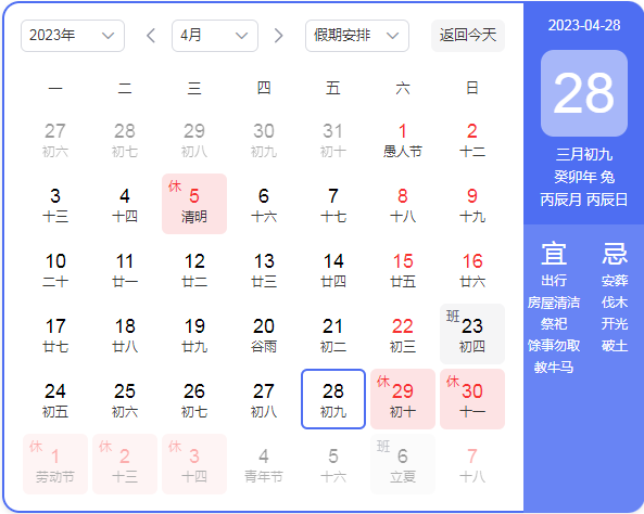 放假時間:2023年4月29日(星期六)至5月3日(星期三),共計五天。